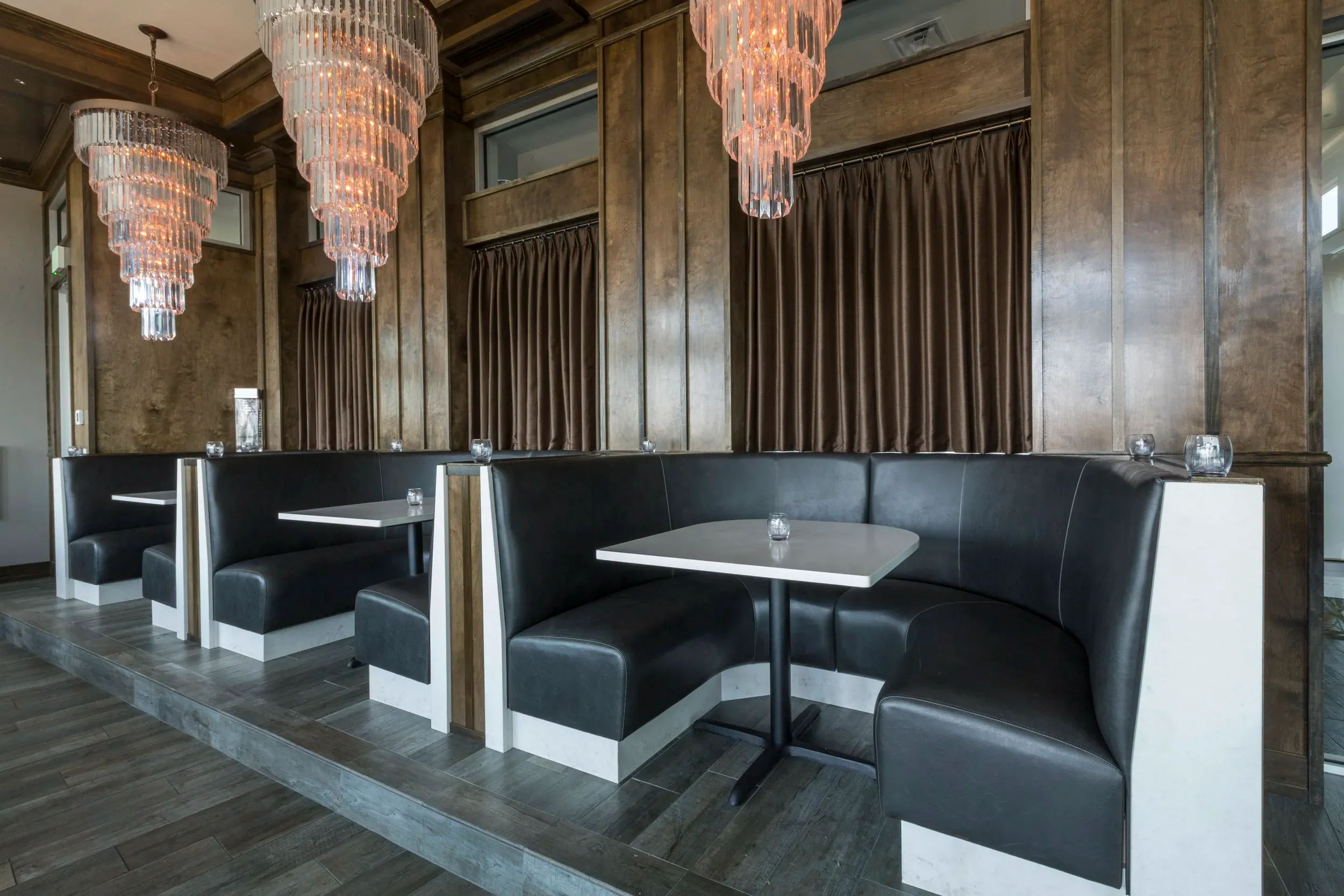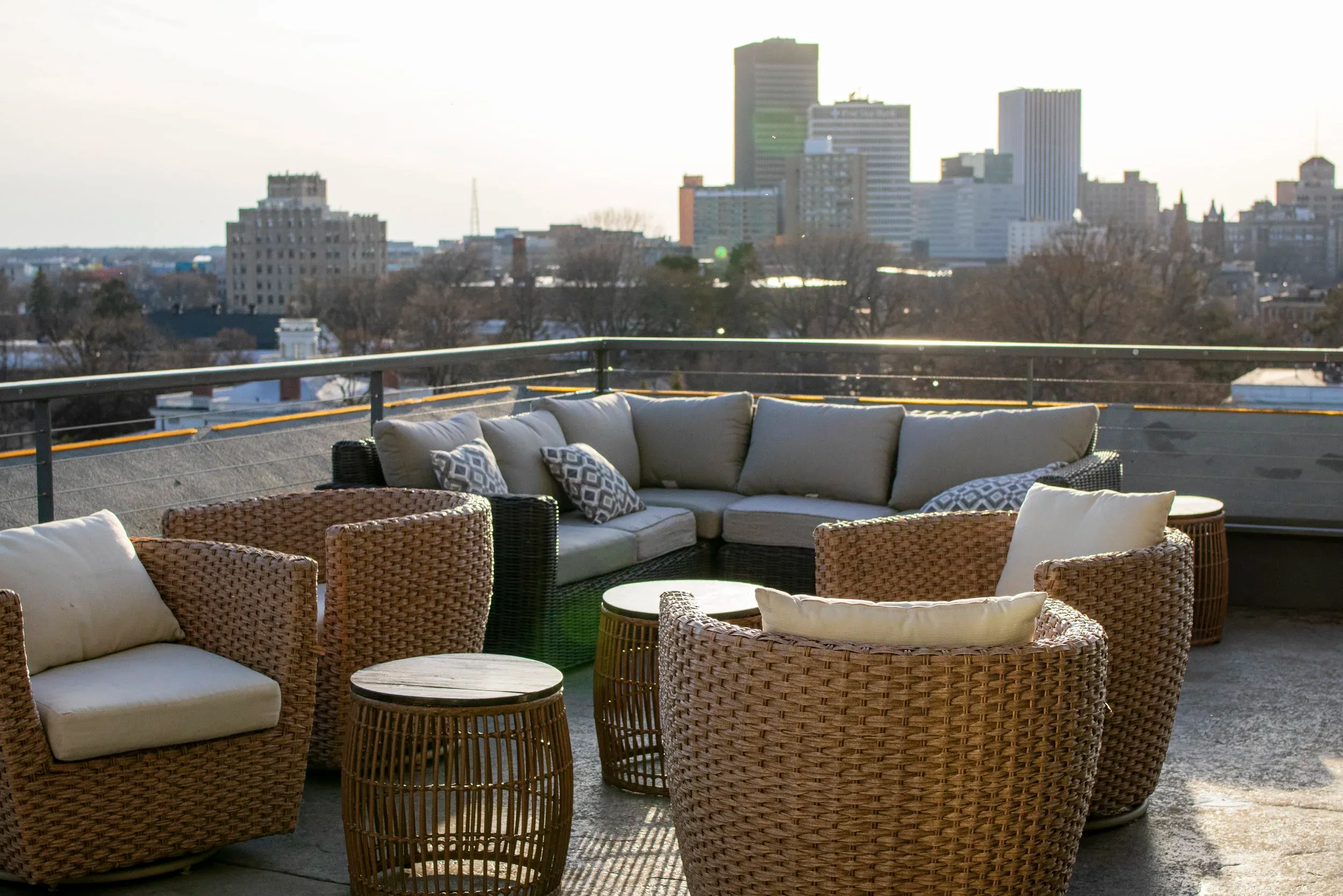 Perched atop The Strathallan, on the 9th floor, Hattie's Rooftop is a fusion of modern sophistication and timeless elegance. Our cocktail lounge invites you to unwind in its plush tufted leather booths, set against mahogany-paneled walls and chandelier-lit ceilings, setting the stage for an evening of relaxation and luxury.
